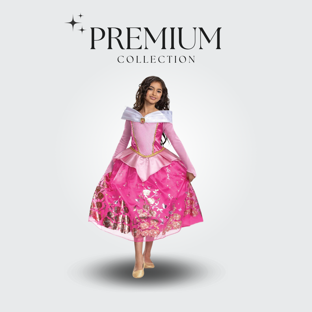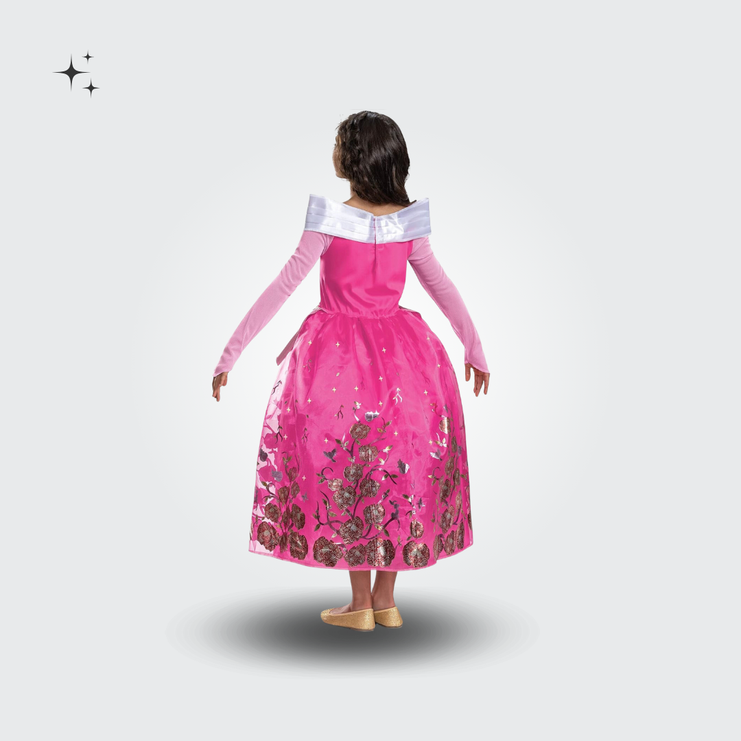 - Elegante vestido con detalles icónicos, de alta calidad, inspirados en la princesa. Tela satinada y brillante, aro en la falda para mantenerla con volumen. Medalla con imagen de Aurora incorporada en el vestido.