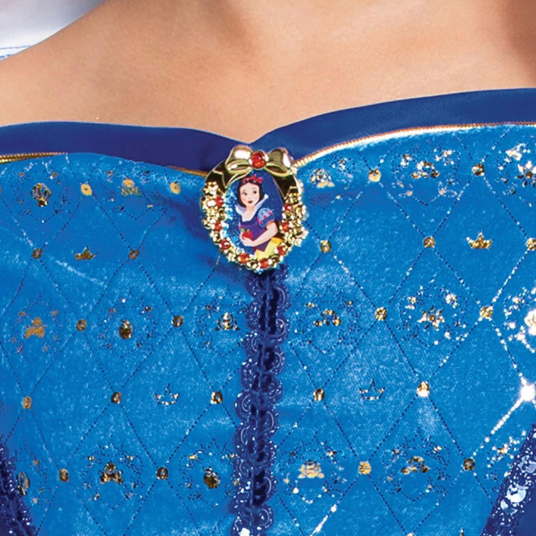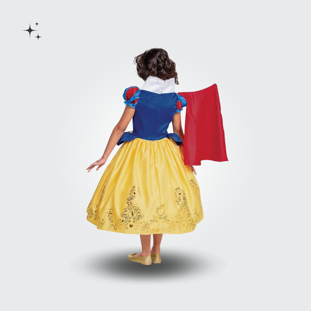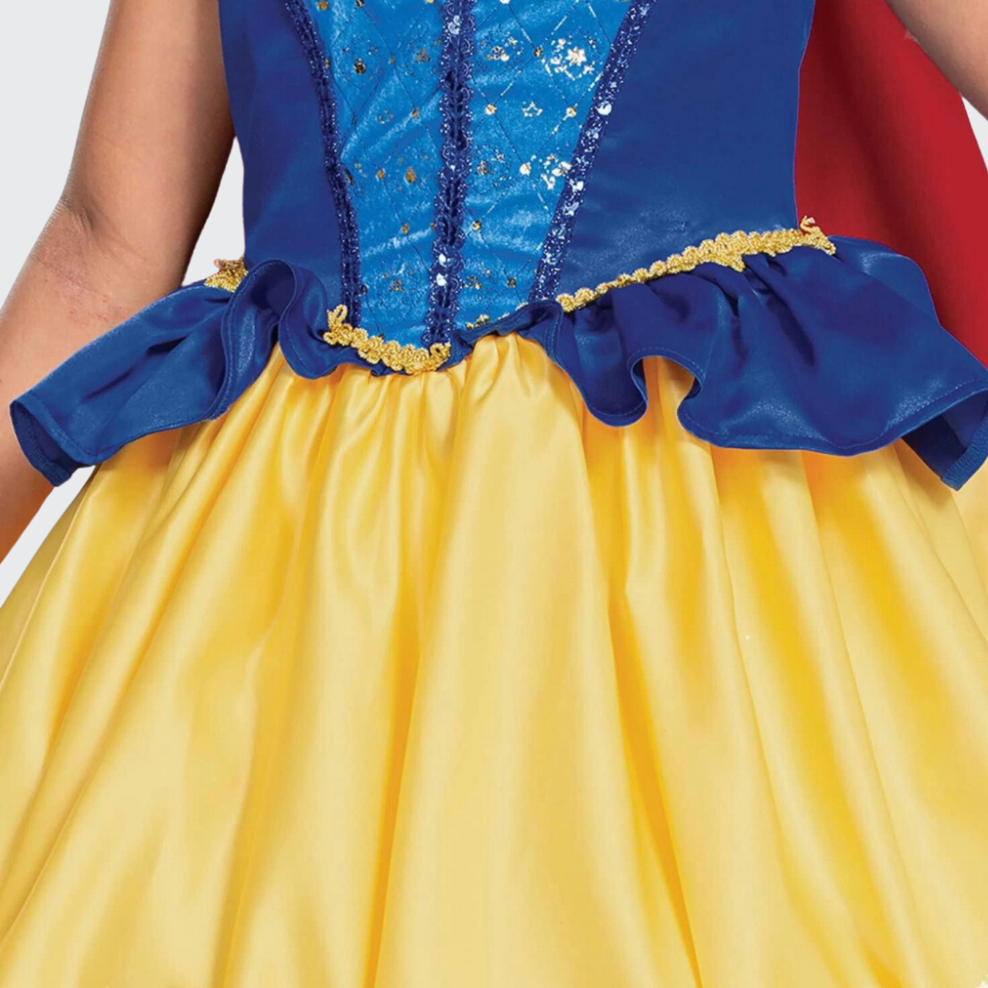 - Elegante vestido con detalles icónicos, de alta calidad, inspirados en la princesa. Tela satinada y brillante, capa roja y hombros pomposos, aro en la falda para mantenerla con volumen. Medalla con imagen de Blanca Nieves incorporada en el vestido.