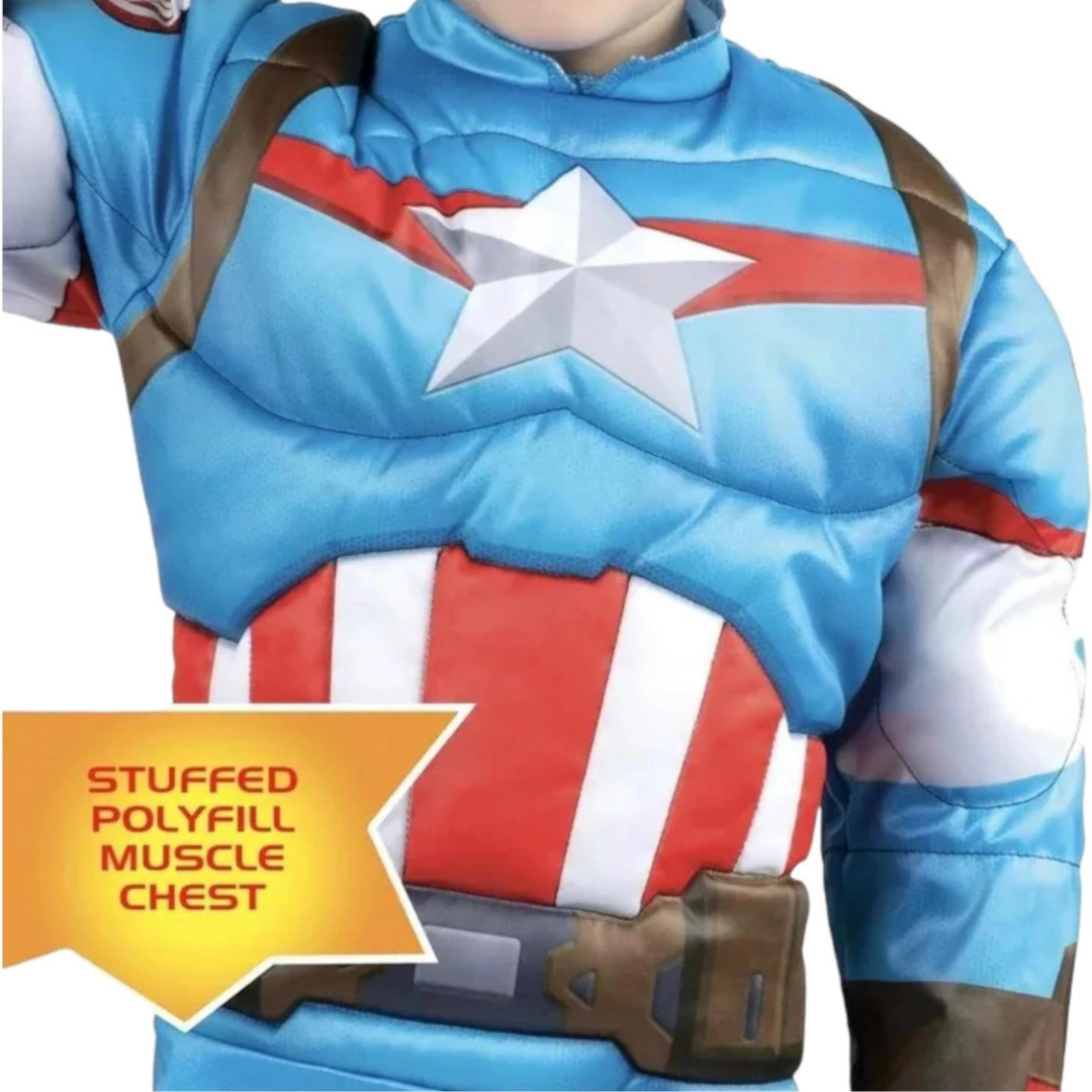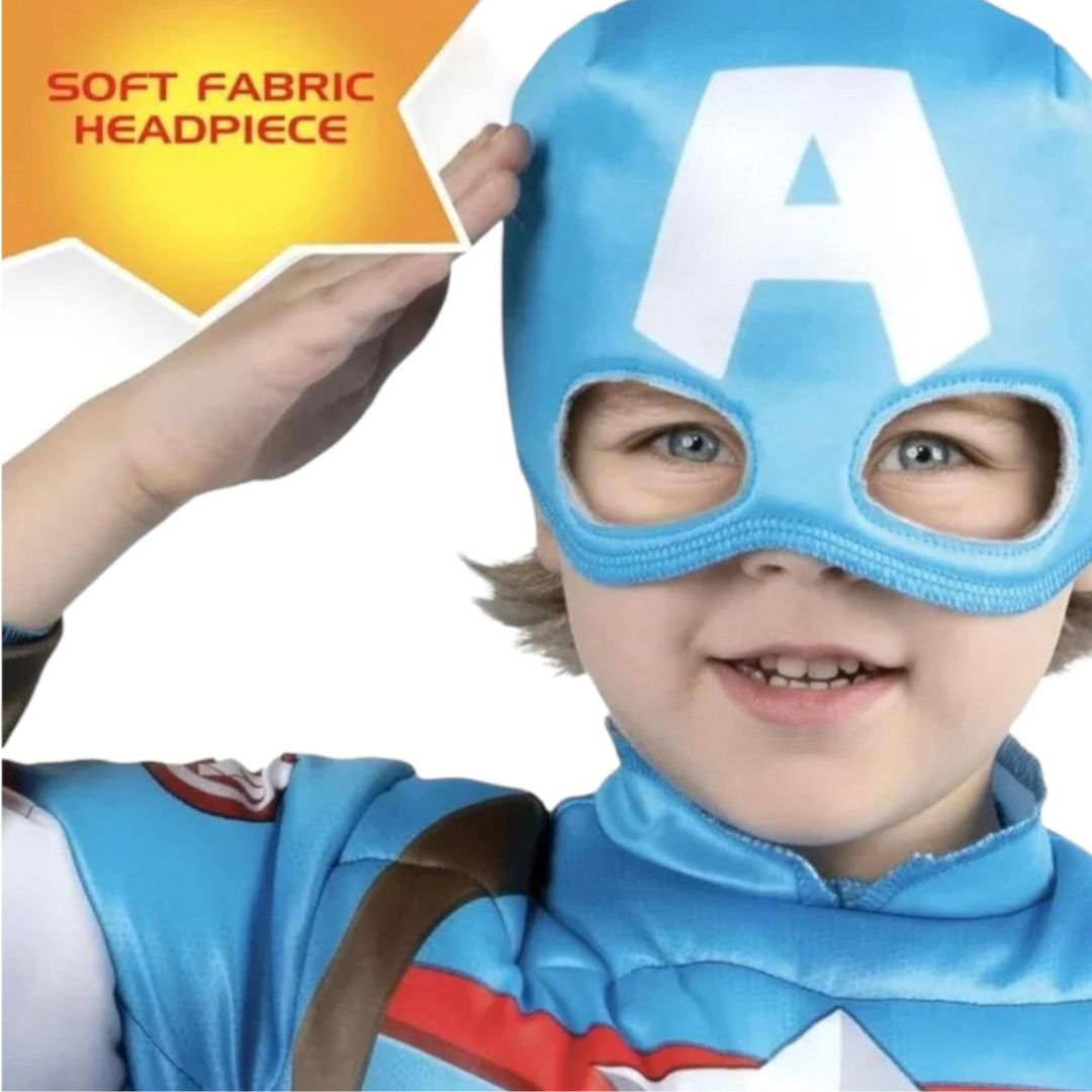 Disfraz jumper completo y máscara de tela suave, acolchonado en pecho y brazos para simular musculatura. Con logo de Avengers.