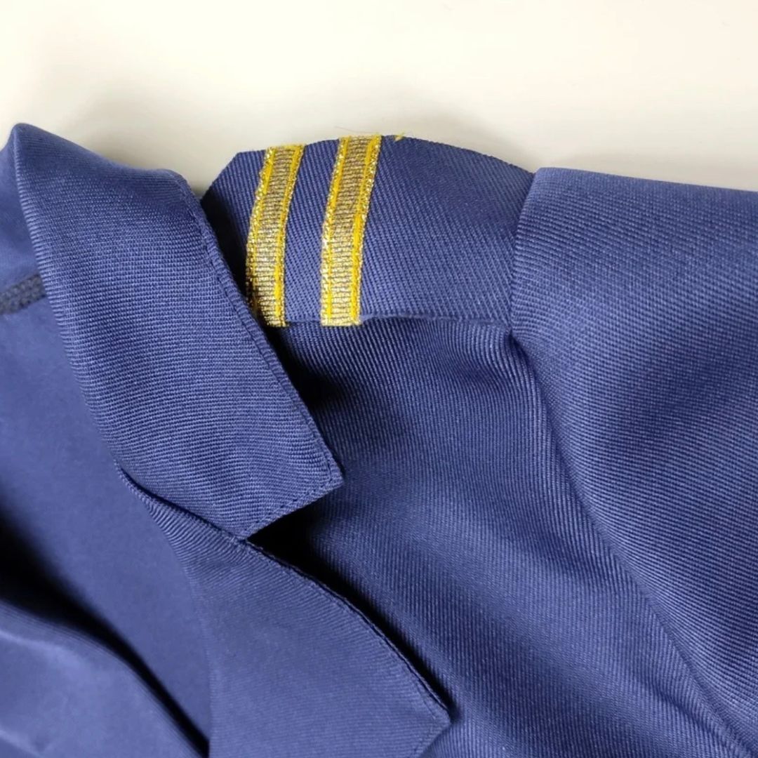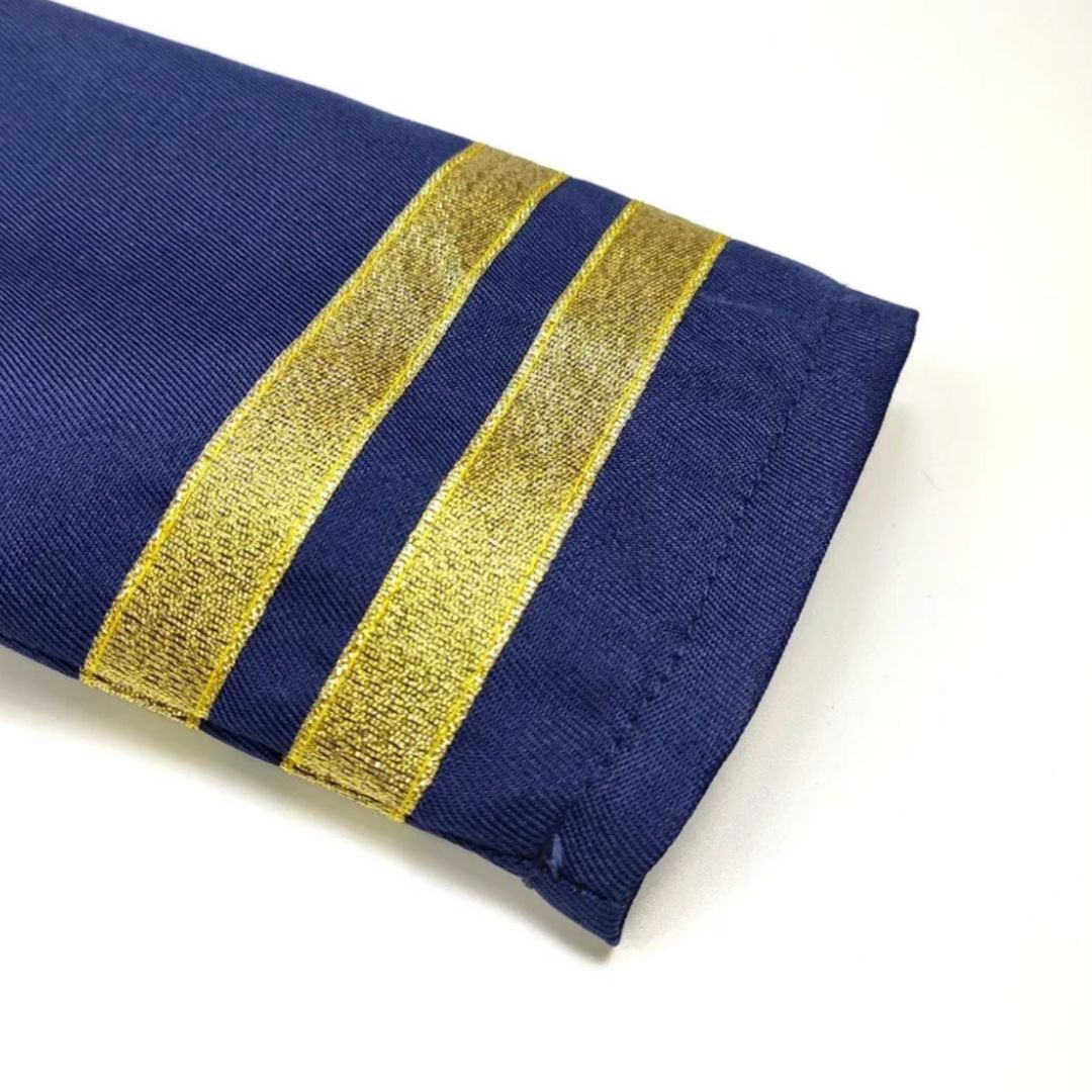 Chaqueta color azul, con detalles característicos como las líneas y botones dorados e insignia.